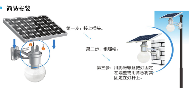 LED太陽能路燈不需要電纜的鋪設:在安裝太陽能路燈時,只需要一個水泥基座,然后用螺絲在法蘭盤上固定即可,省去了大量的綜合成本。源碼太陽能智慧路燈的安裝更是簡單方便,只需一把螺絲刀,一個扳手就能完成,而且也方便了后期的修理維護。